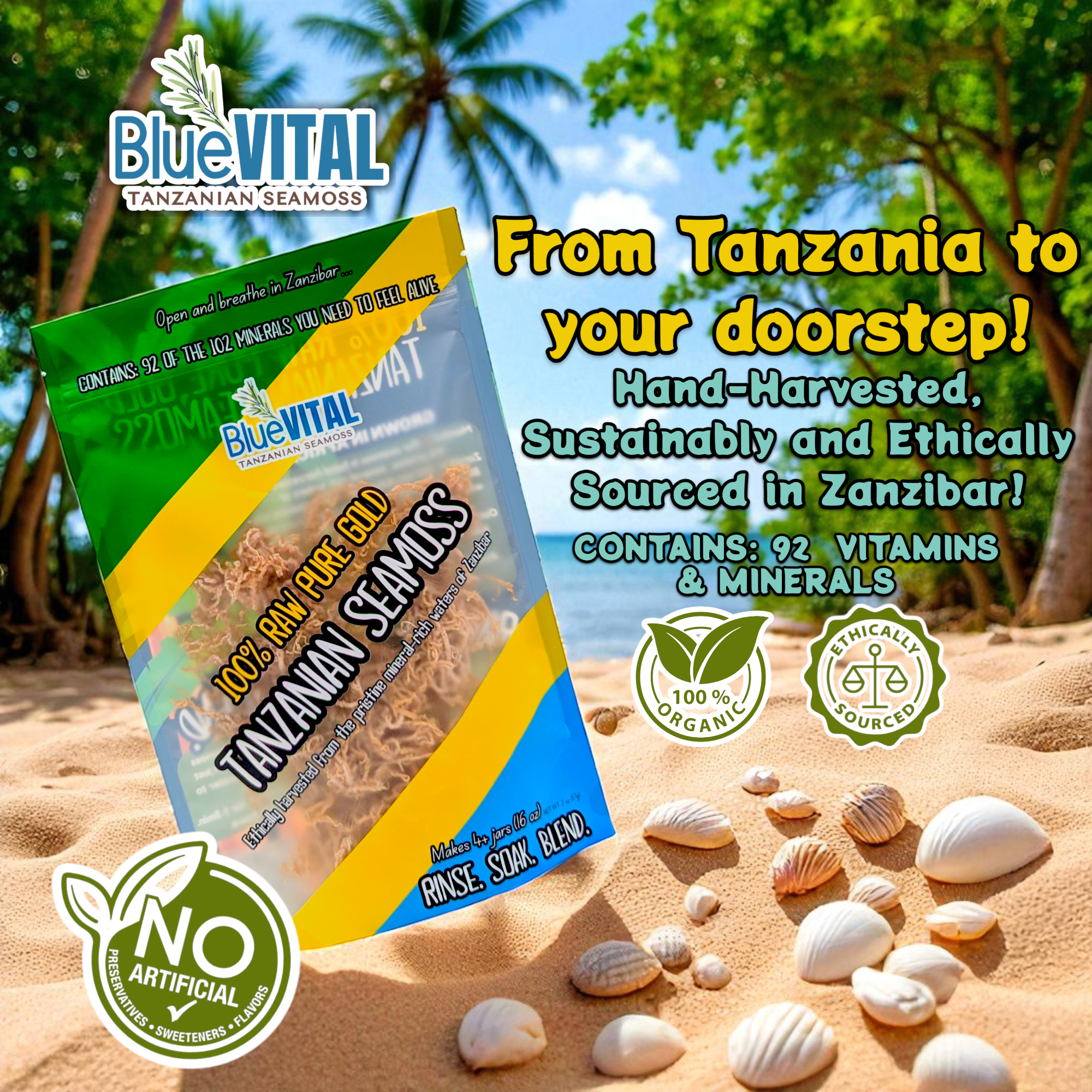 At Blue Vital, we ARE the source! 🌊 Our organic, non-GMO seamoss is hand-harvested in Zanzibar’s pristine waters and made fresh in the USA. Packed with minerals for immunity, digestion, and hormone balance. Pure, affordable, and straight from Tanzania to you!